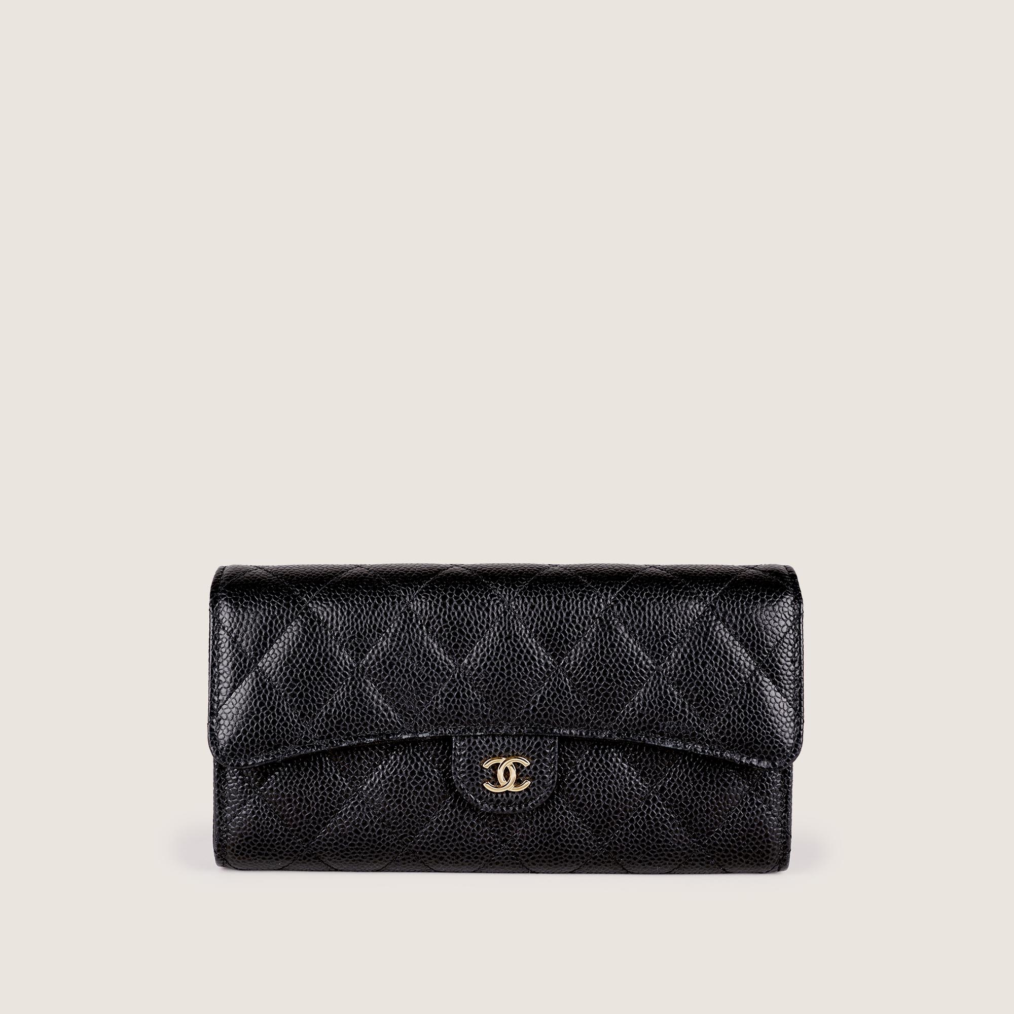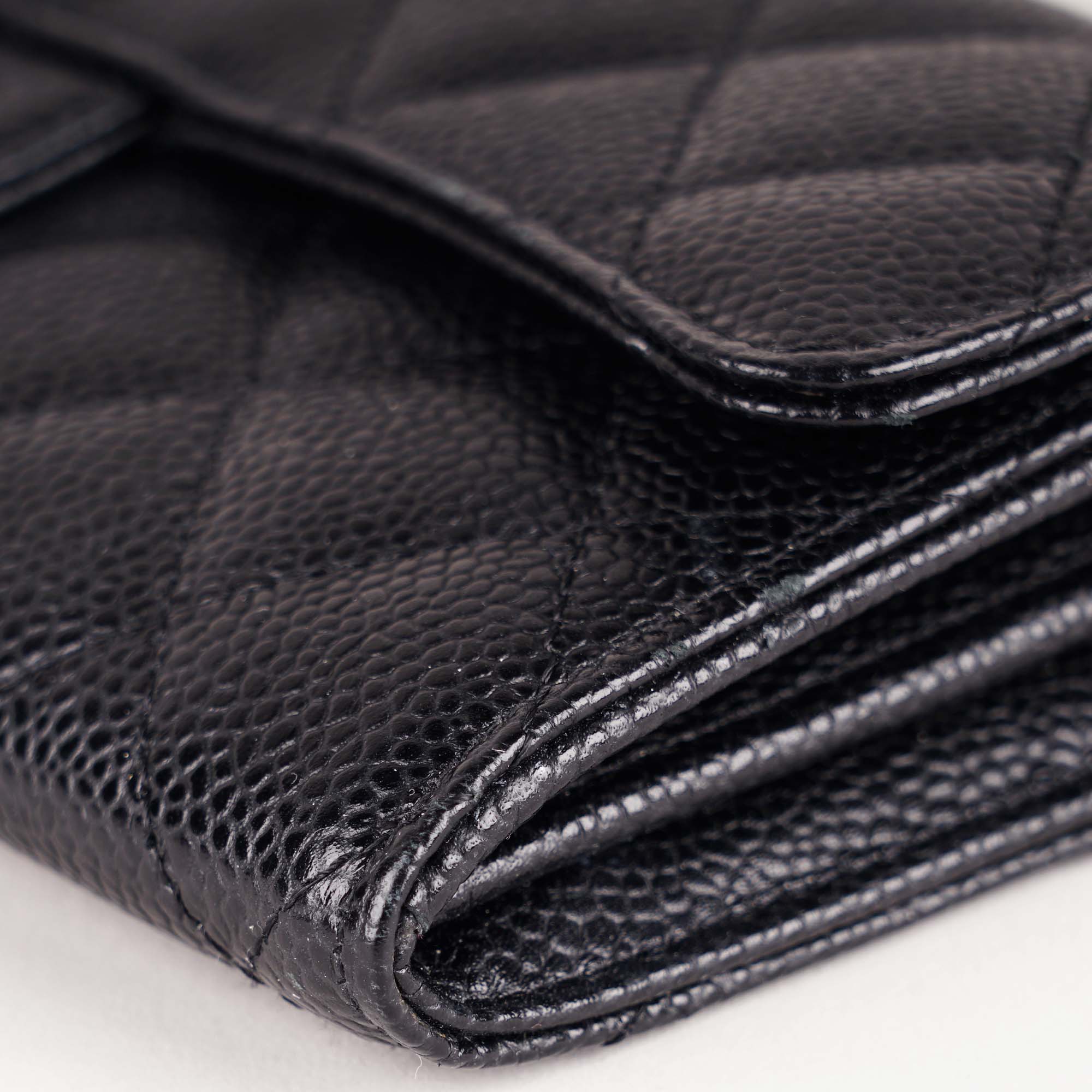 This is an authentic Chanel Classic Long Wallet in Black Caviar Leather with Goldtone hardware.