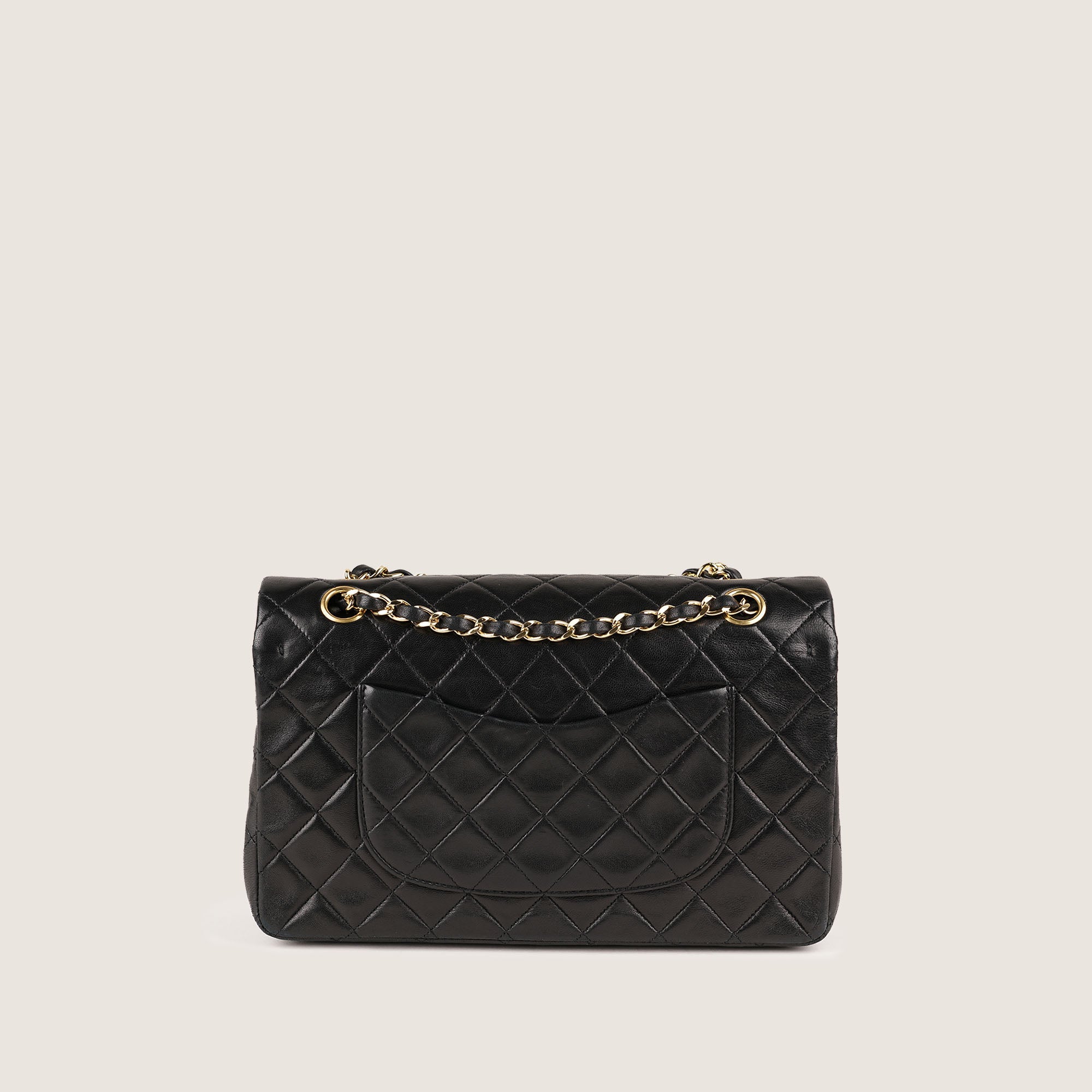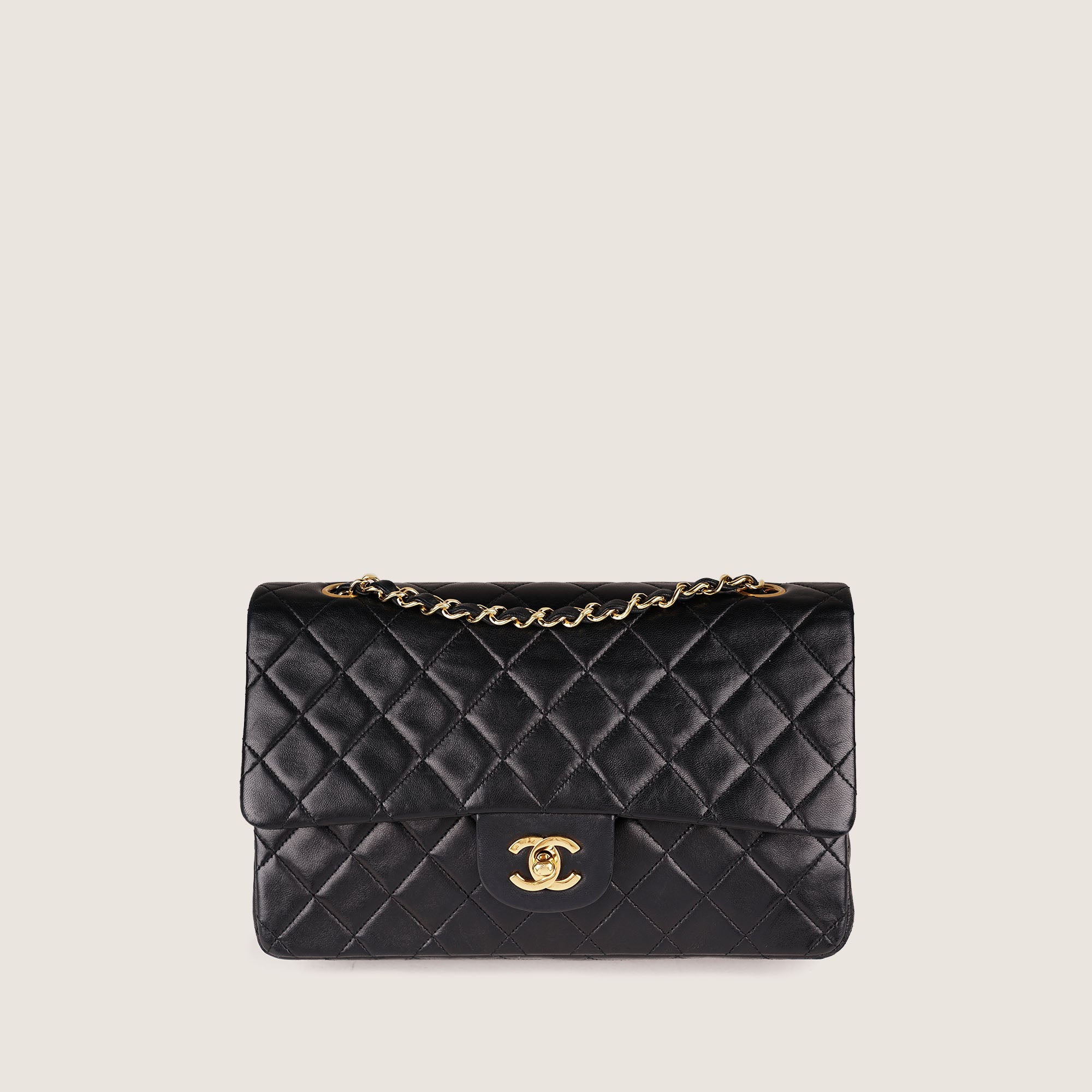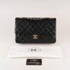 Introducing the magical Classic Medium Double Flap Bag from Chanel! With a stunning color combination of black diamond quilted lambskin and gold hardware, this bag is perfect for all occasions. Its spacious leather interior fits your daily essentials, while the elegant 24-carat gold-plated hardware and CC twist lock add a touch of luxury. Versatile and stylish, don't miss out on this must-have accessory Chanel!