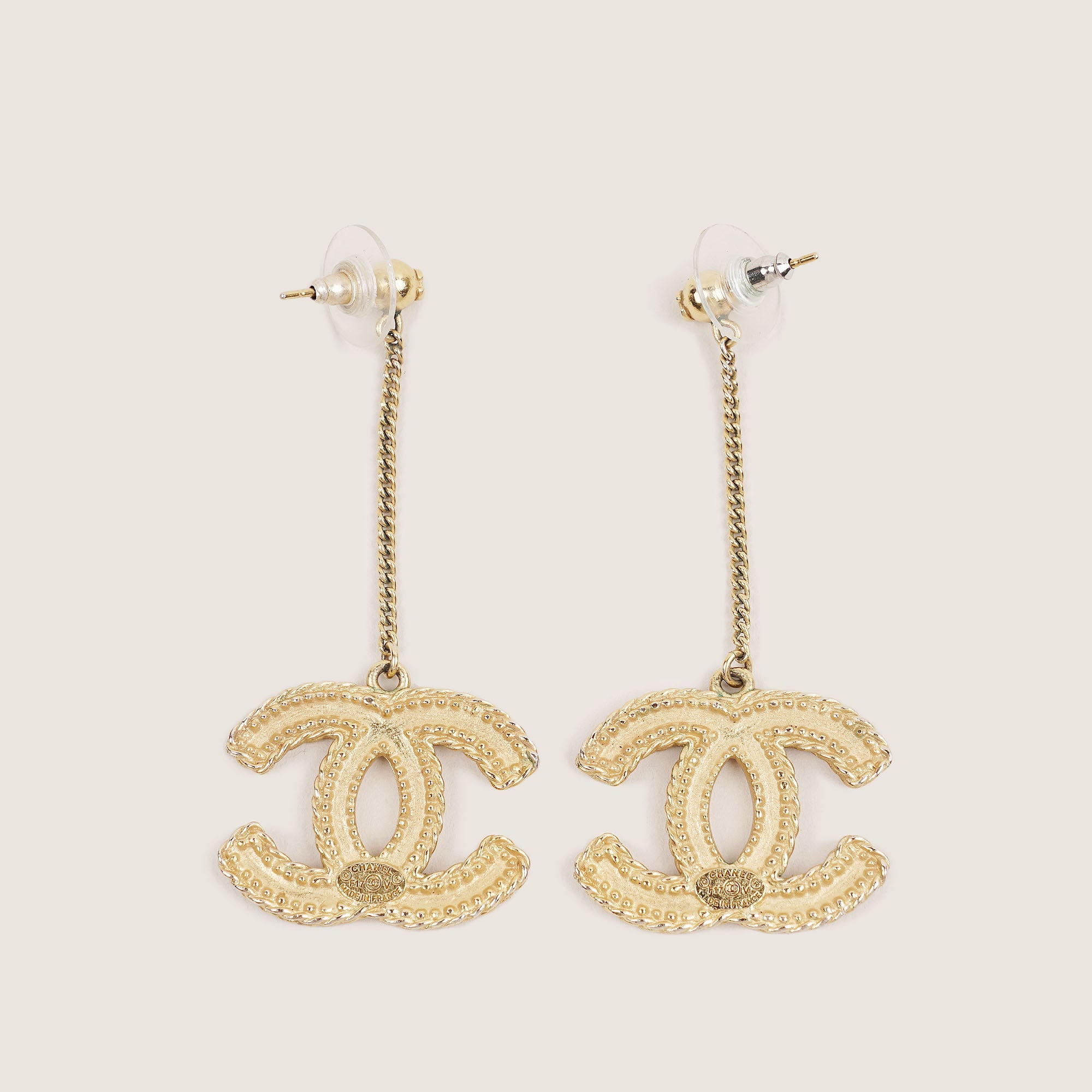 These are a pair of authentic Chanel Drop Earrings in gold-tone metal from the 2017 collection.