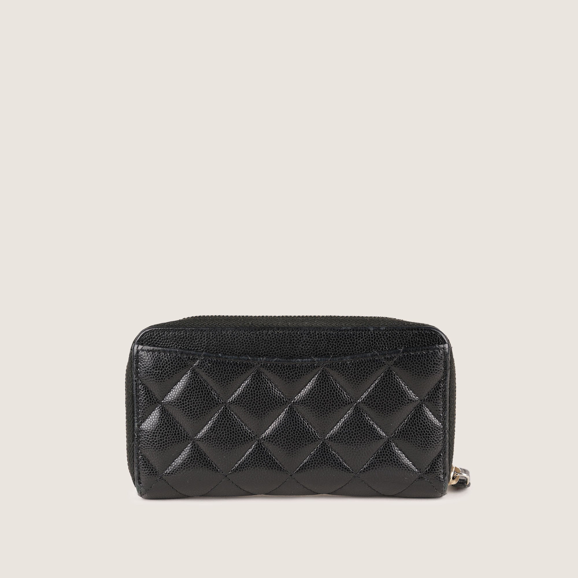 The Chanel Zip Around Wallet features durable shiny Caviar leather paired with gold-colored hardware and the signature CC logo. The zip-around closure opens to a practical and well-structured interior with multiple card slots, bill compartments and a central zip pocket, offering secure and efficient organization of your daily essentials.