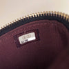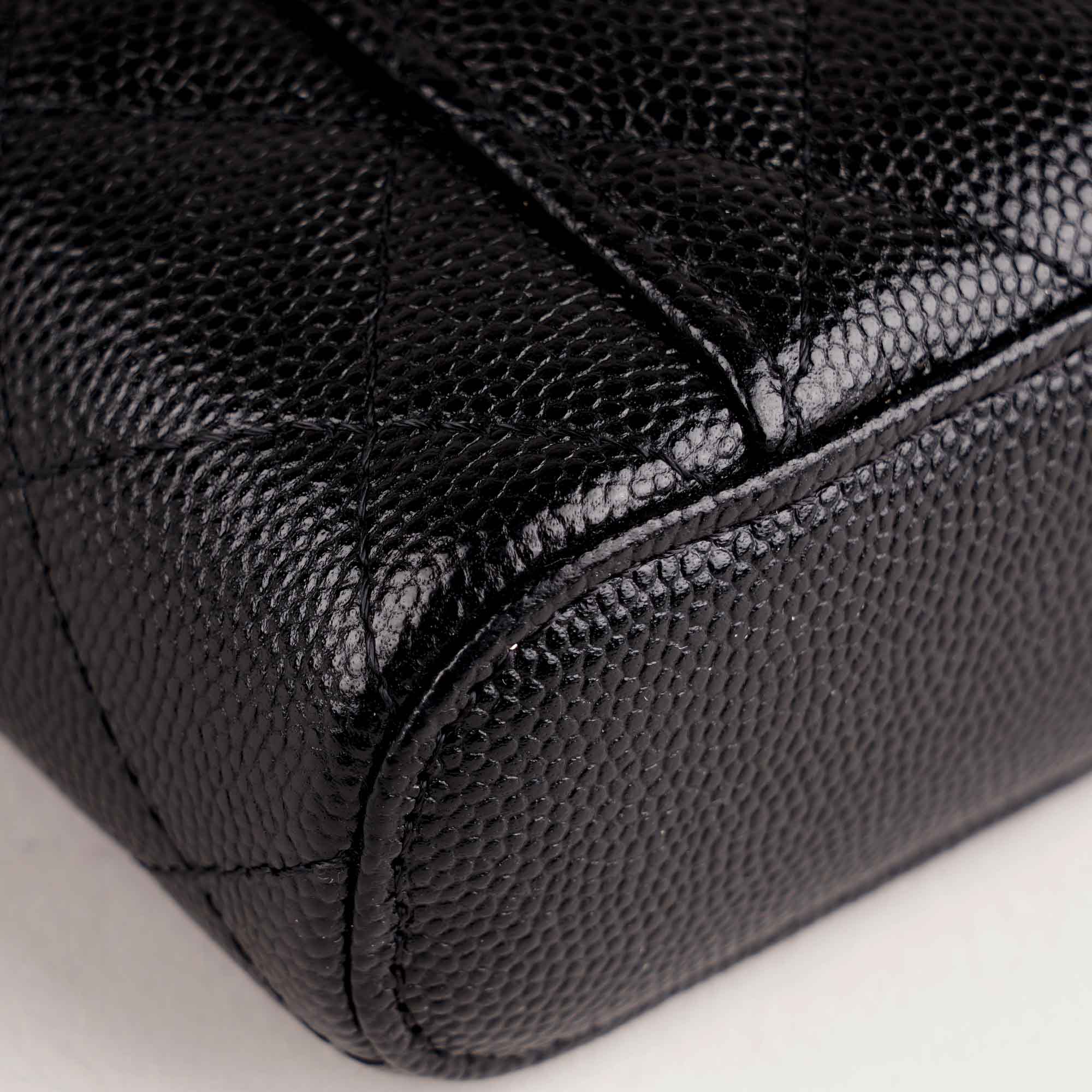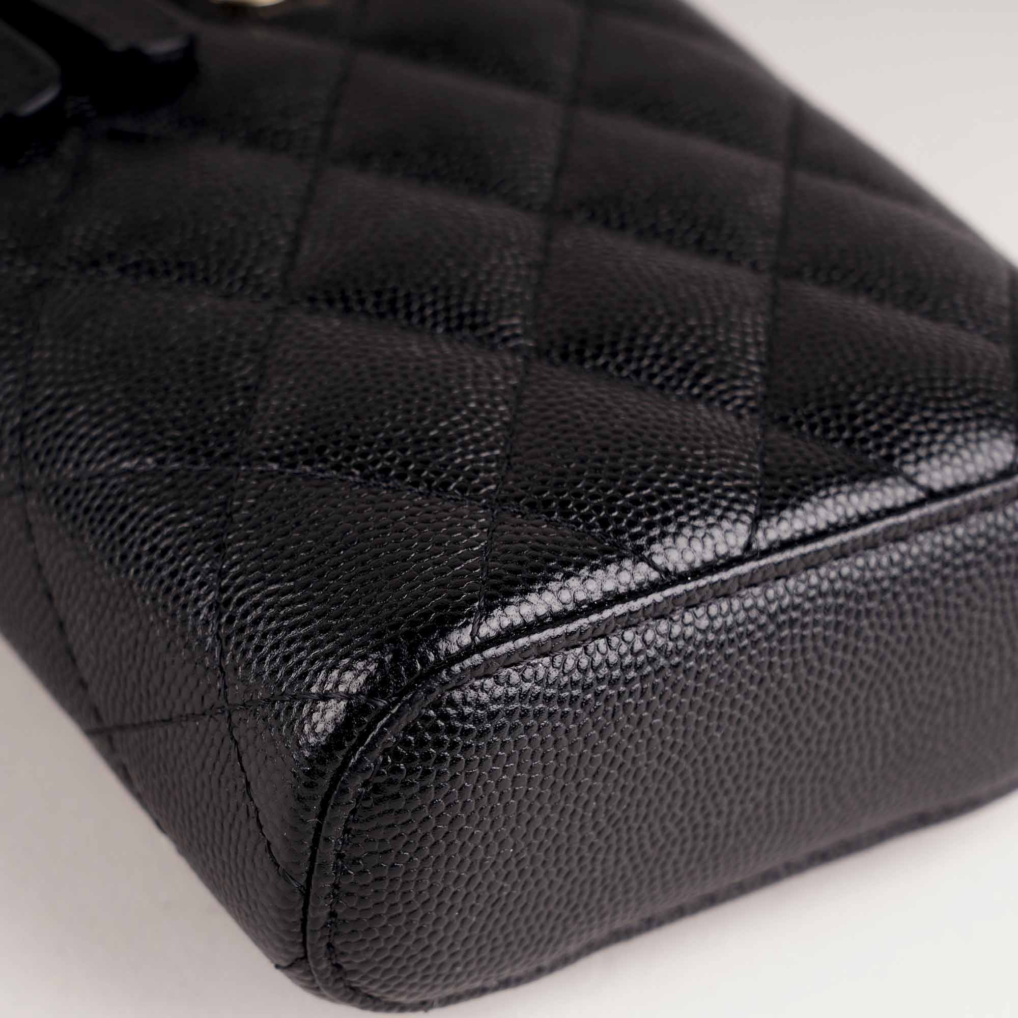 This Chanel Vanity bag is made from durable black diamond quilted caviar leather with gold-colored hardware. It features a leather threaded gold chain-link shoulder strap and a small CC-logo at front. The 3/4 wrap-around zipper opens to a burgundy fabric interior, making it a versatile and stylish shoulder bag for any occasion. Don’t miss out!
