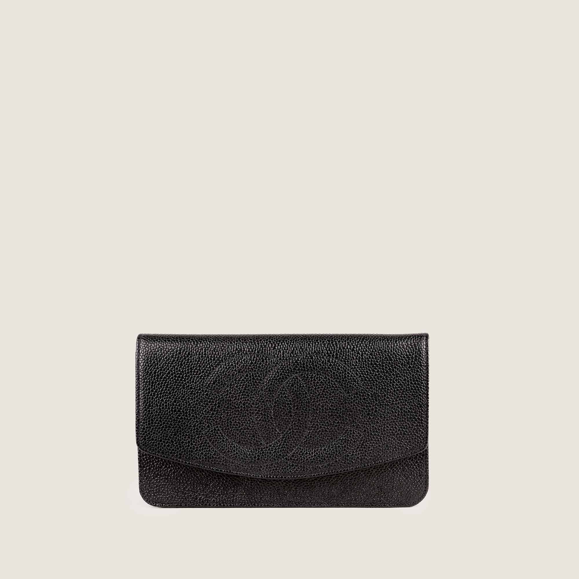 This is an authentic Chanel Vintage CC Clutch in Black Caviar Leather.
