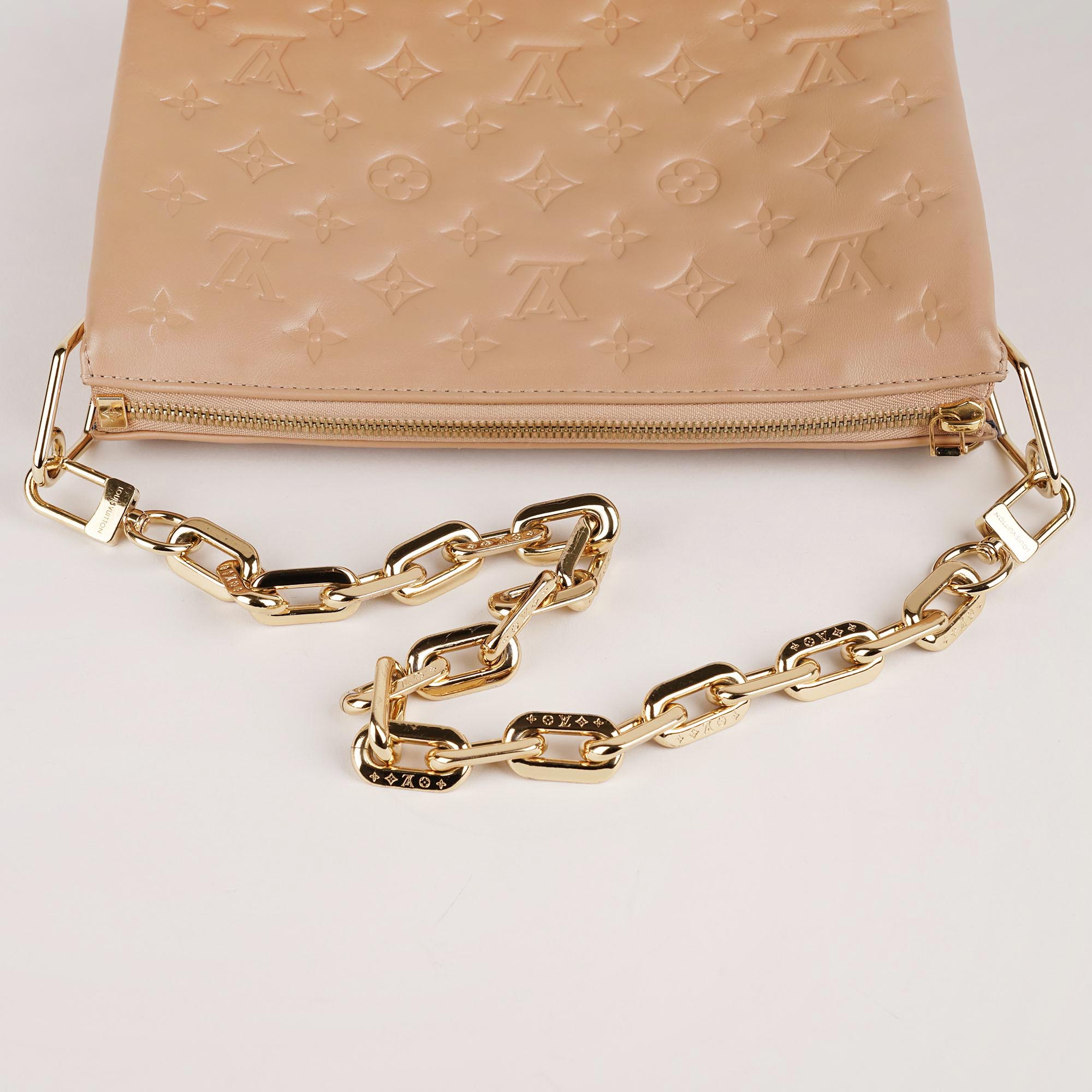 This handbag is crafted from puffy Monogram Embossed Lambskin in Camel and gold-colored metal hardware. The top zipper opens up to a spacious interior and two inside compartments with a convenient zippered pocket, providing ample storage and organization. Due to the detachable shoulder strap and chunky gold metal chain that also can be worn as a necklace, this versatile bag offers both style and functionality. Perfect for any occasion, the Coussin PM is a must-have for fashion-forward individuals. Don't miss out!