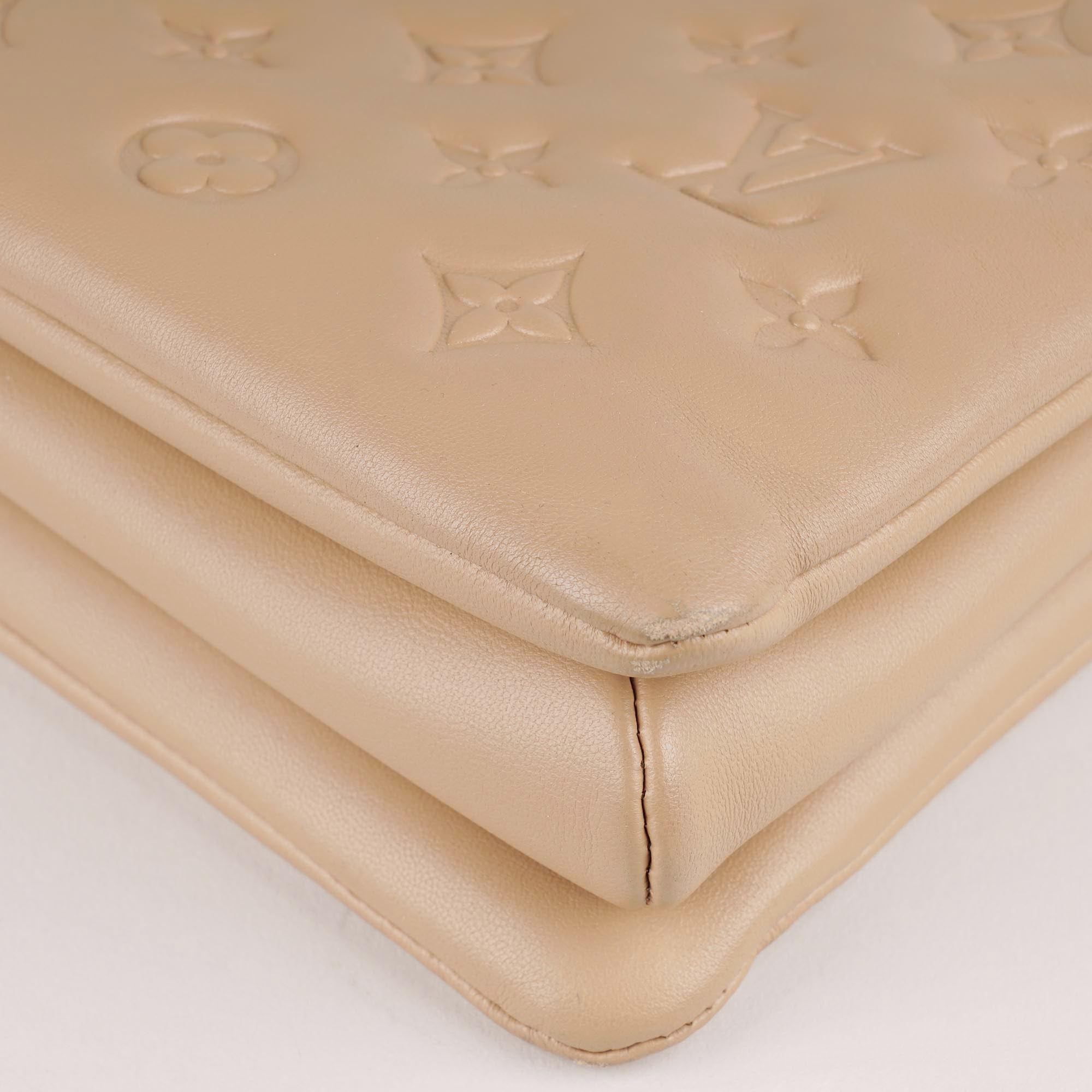 This is an authentic Louise Vuitton Coussin PM Bag Camel Monogram Embossed Puffy Lambskin.