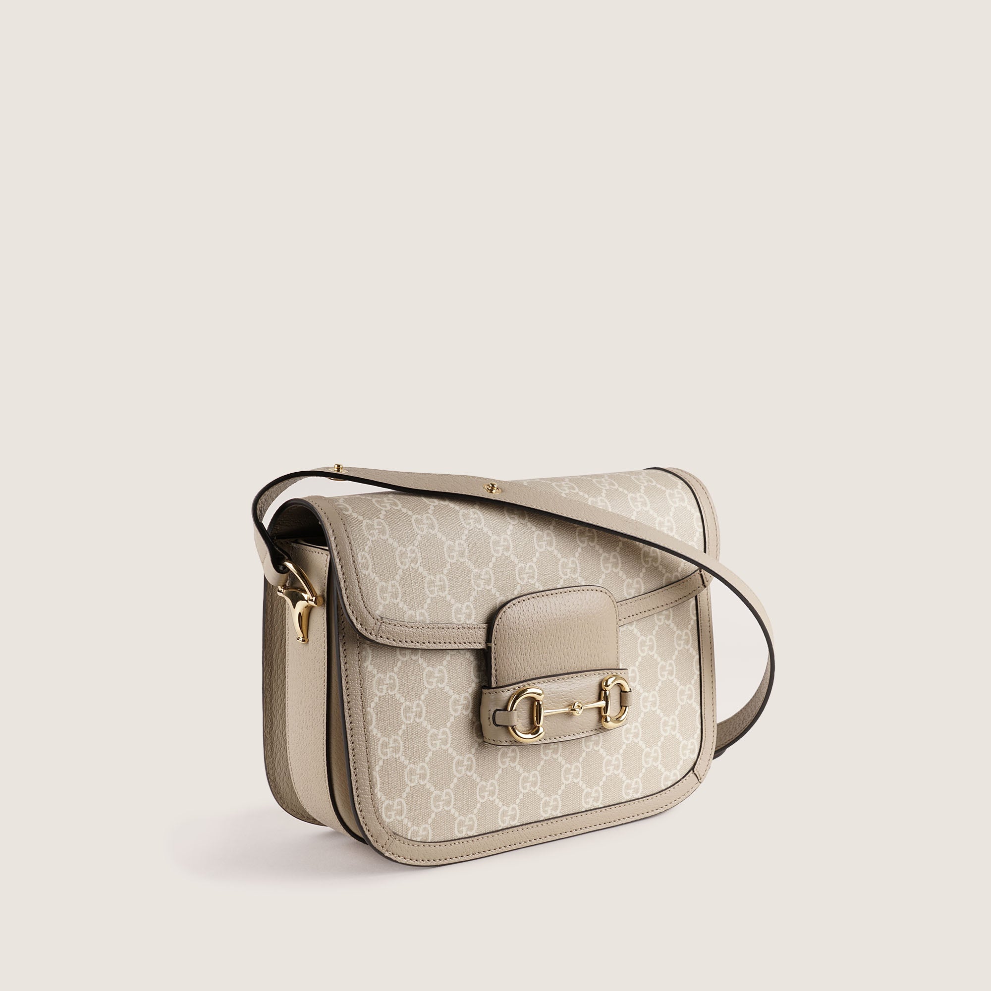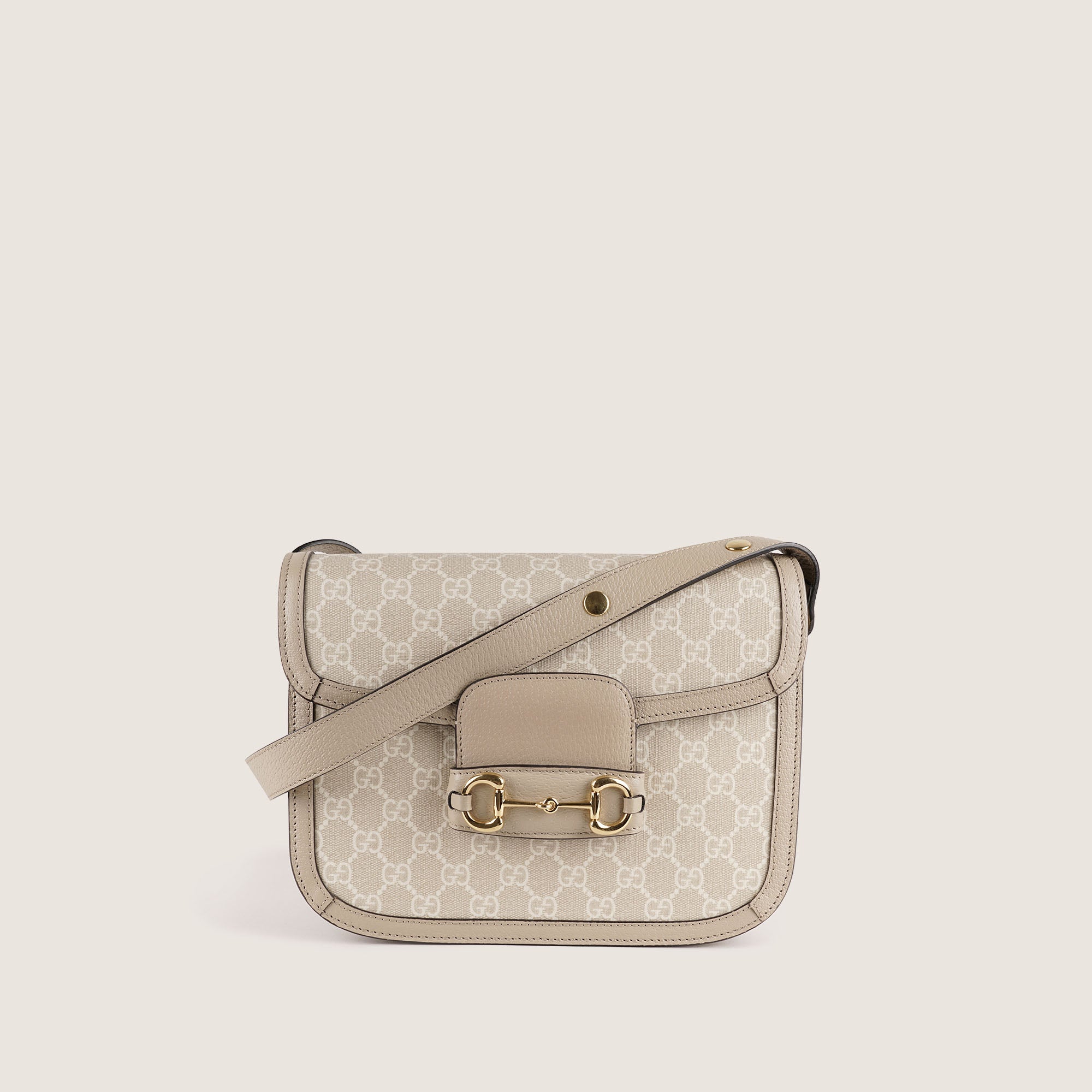 The bag is crafted in beige and white canvas with smooth leather trim and features the iconic Horsebit detail on the front. The structured shape and medium size make the Gucci Horsebit Medium Bag perfect for both everyday use and more elevated occasions. It can be carried by hand, on the arm or over the shoulder for a sophisticated look. A true investment piece for any luxury collection. Don’t miss out!