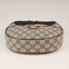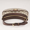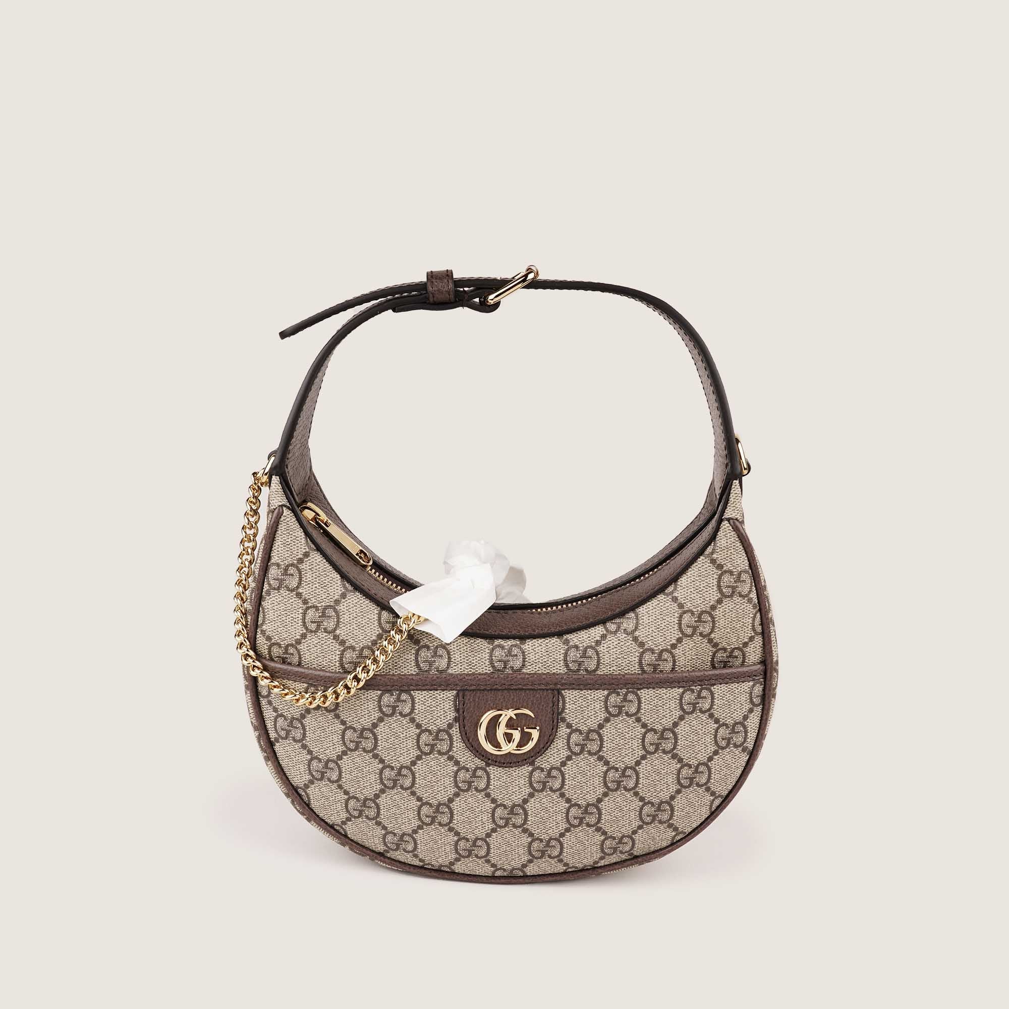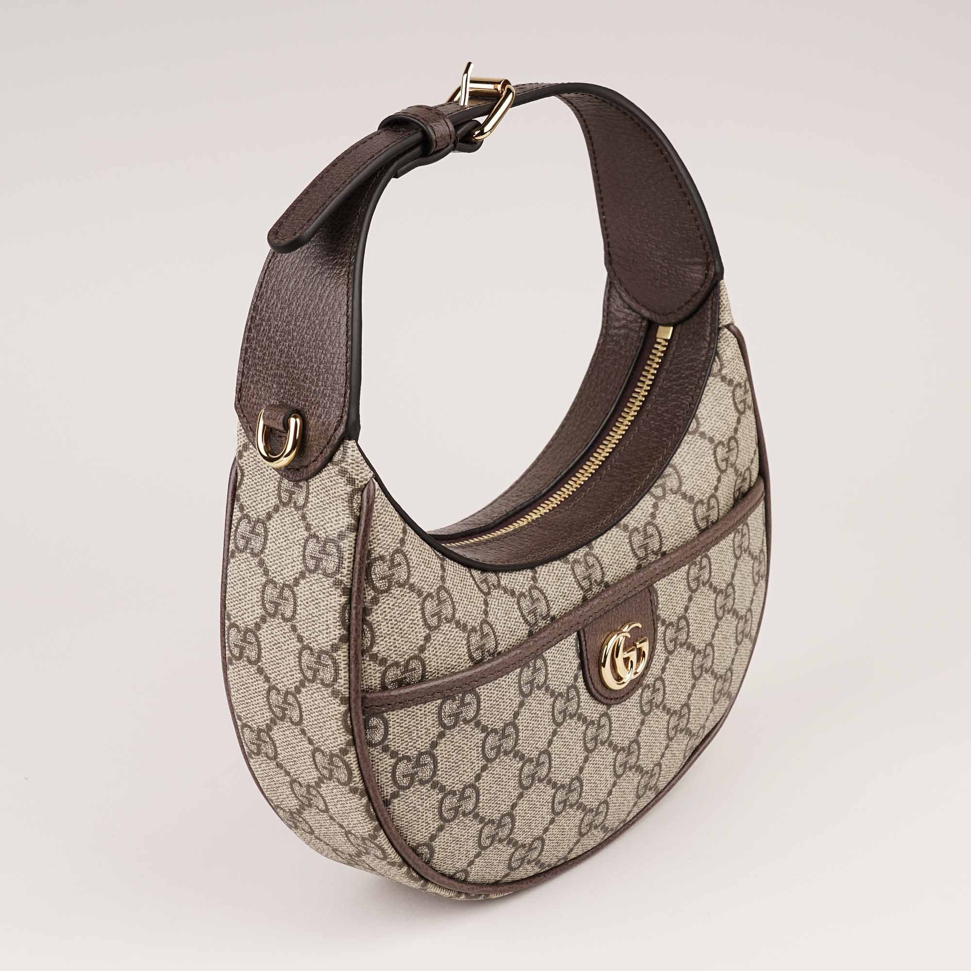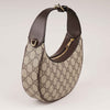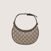 This is an authentic Gucci Mini Half-Moon Shoulder Bag in GG Monogram Canvas with brown leather and light gold-tone hardware.