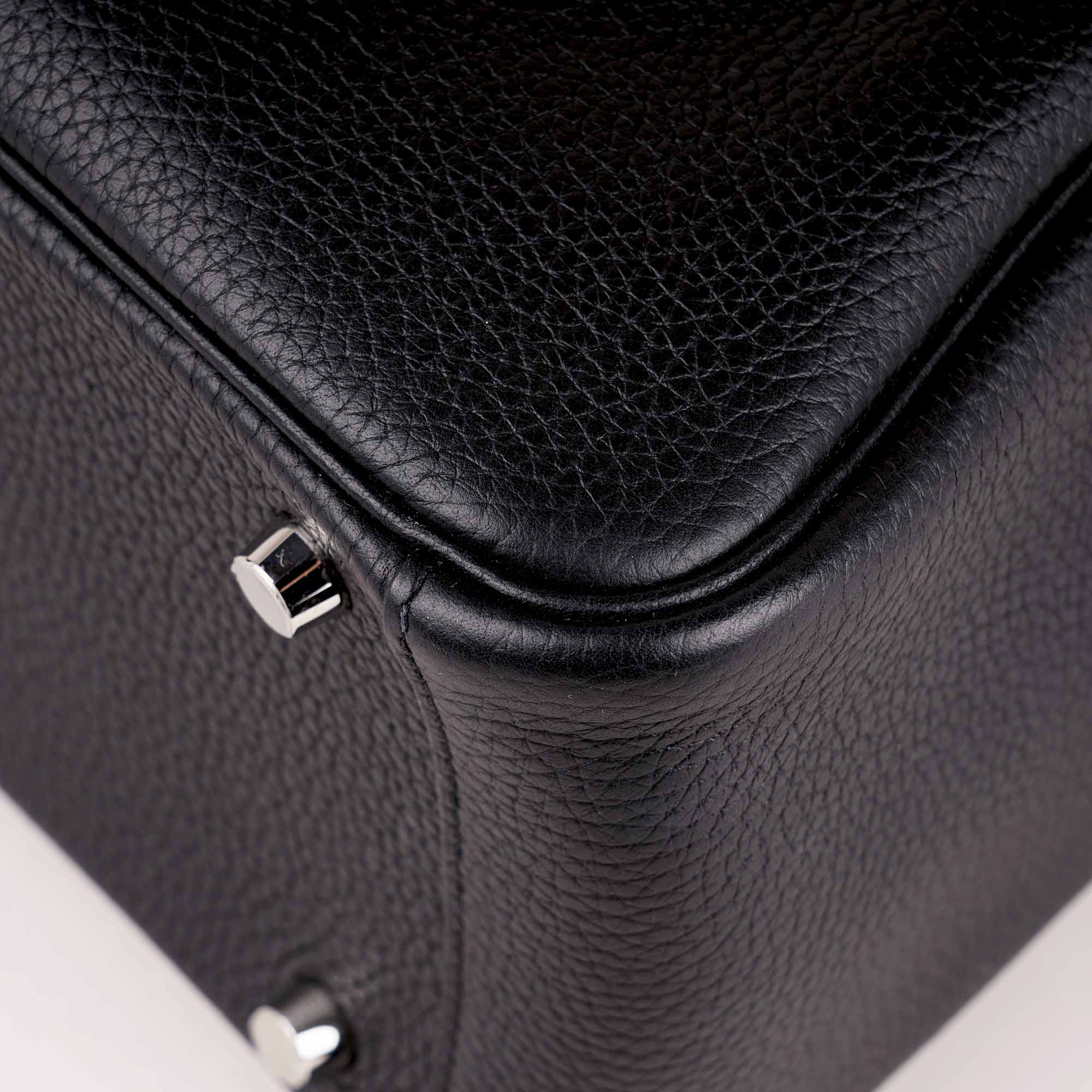 This is an authentic Hermès Lindy 26 in Black Clemence Leather with pAkkadian plated hardware.