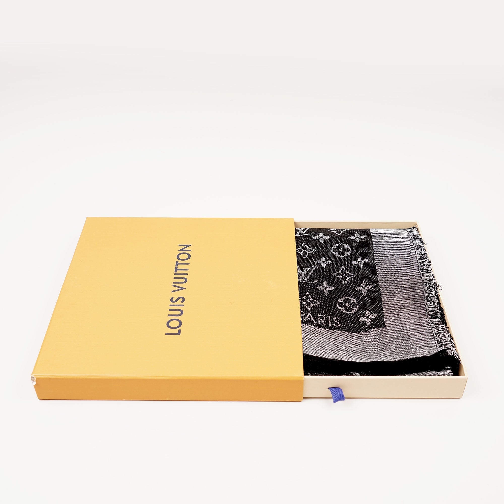 This is an authentic Louis Vuitton Monogram Shine Shawl in Black Metallic Silk/Wool/Viscose.