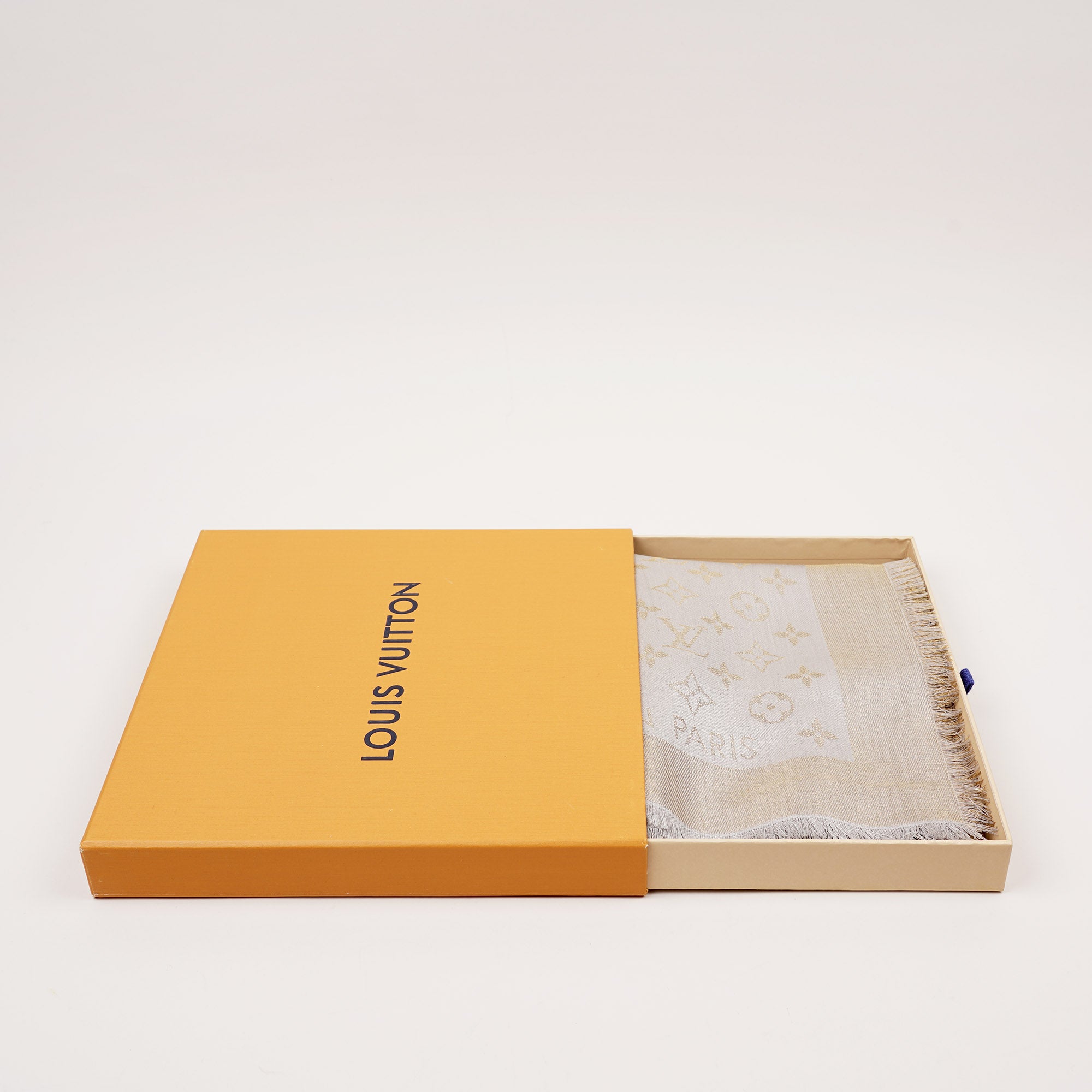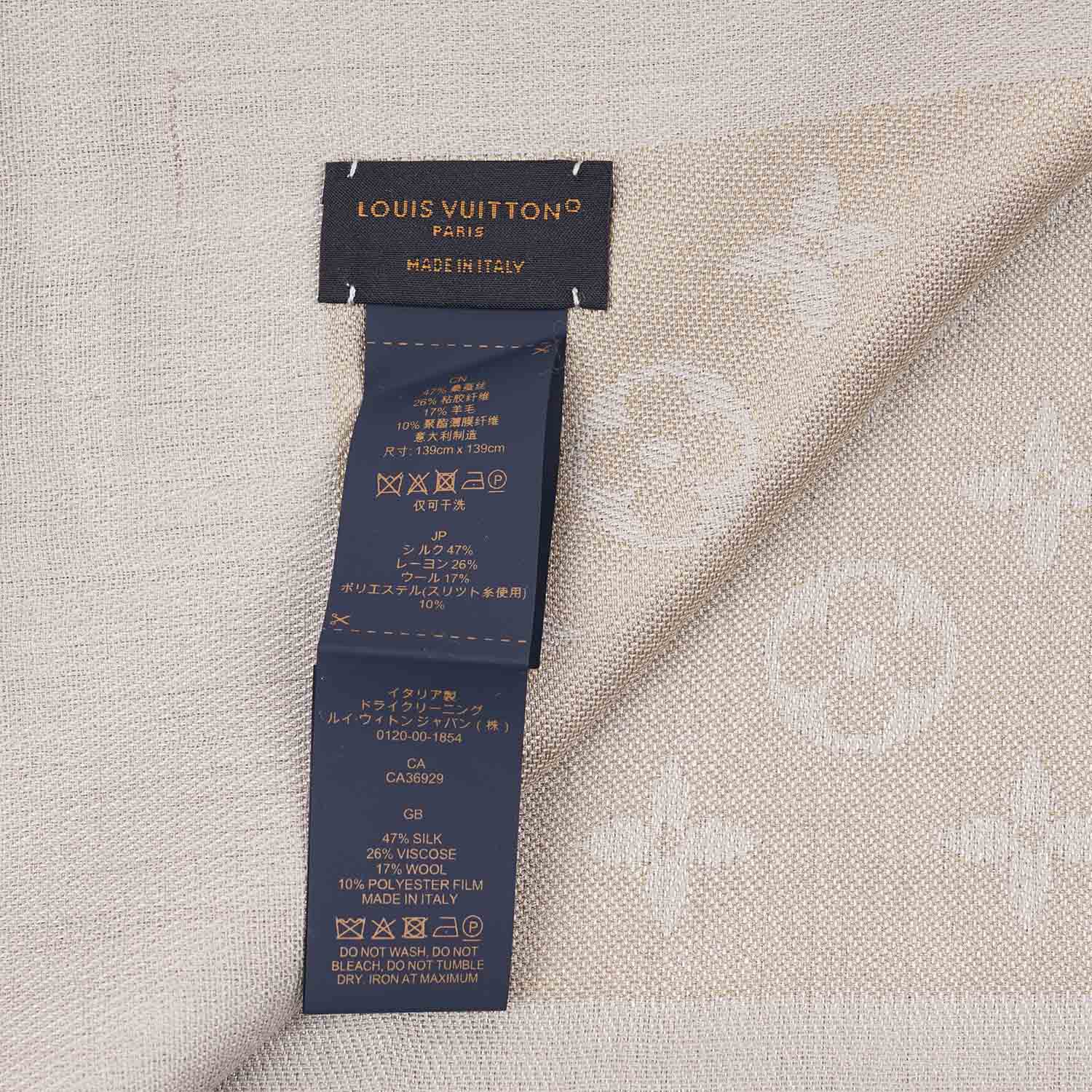 This is an authentic Louis Vuitton Monogram Shine Shawl in Greige Silk/Wool/Viscose.