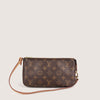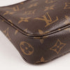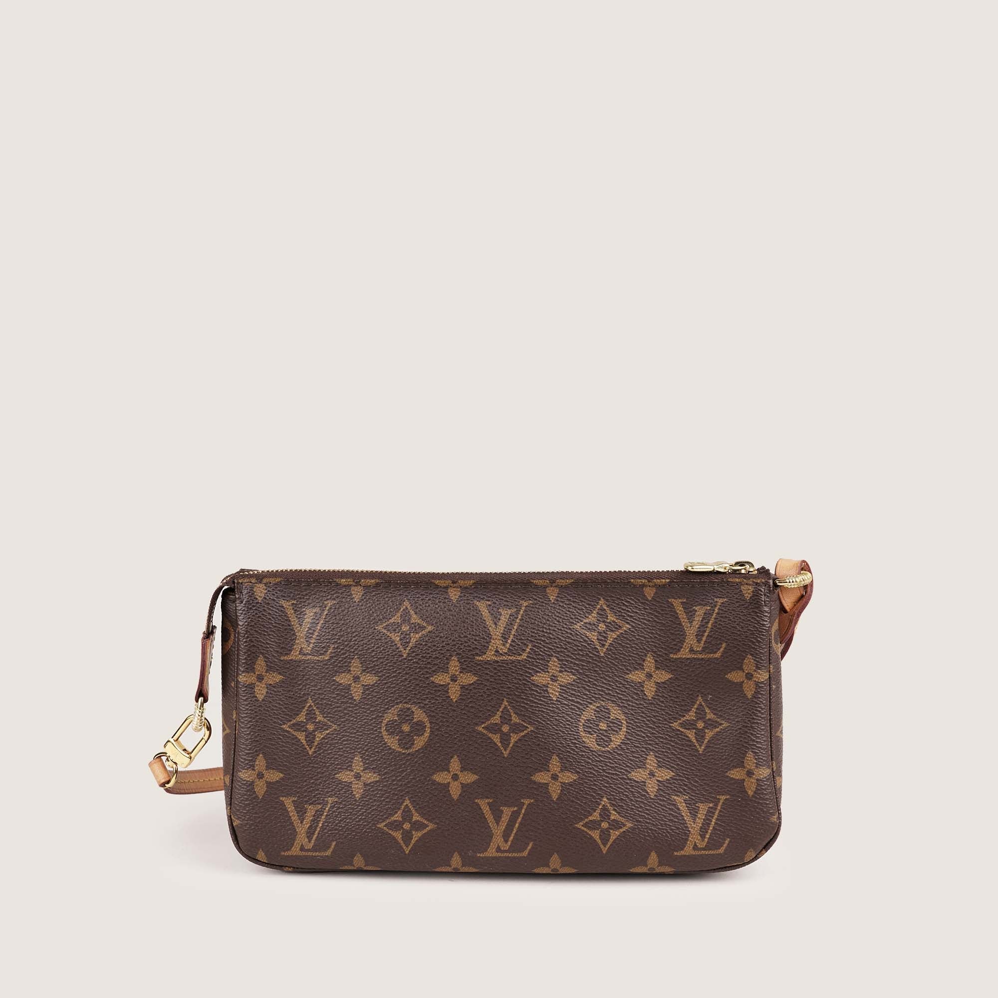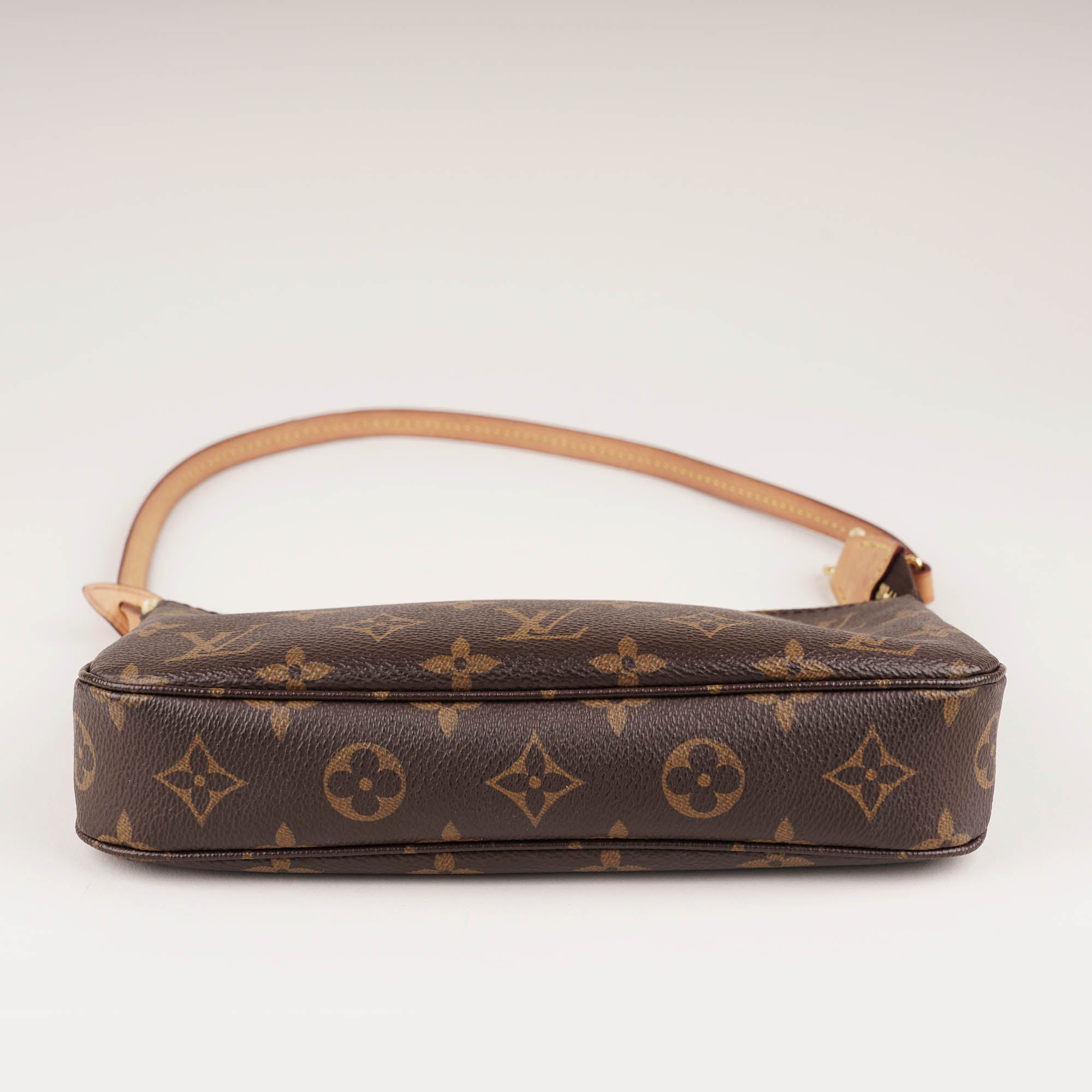 This is an authentic Louis Vuitton Pochette Accessoires NM in Monogram canvas with gold colored hardware. The New Model features a refined design with a longer and wider removable leather strap, making it versatile and easy to style.