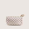 The Pochette NM ("new model") features a refined design with a longer and wider removable leather strap, making it versatile and easy to style. Crafted from elegant Damier Azur canvas with gold-tone metal hardware, this pochette can be carried as a shoulder bag or a clutch. The main beige textile-lined compartment fits your daily essentials, such as a phone, cardholder, keys, and small items, making it perfect for everyday use, travel, and evenings out.