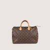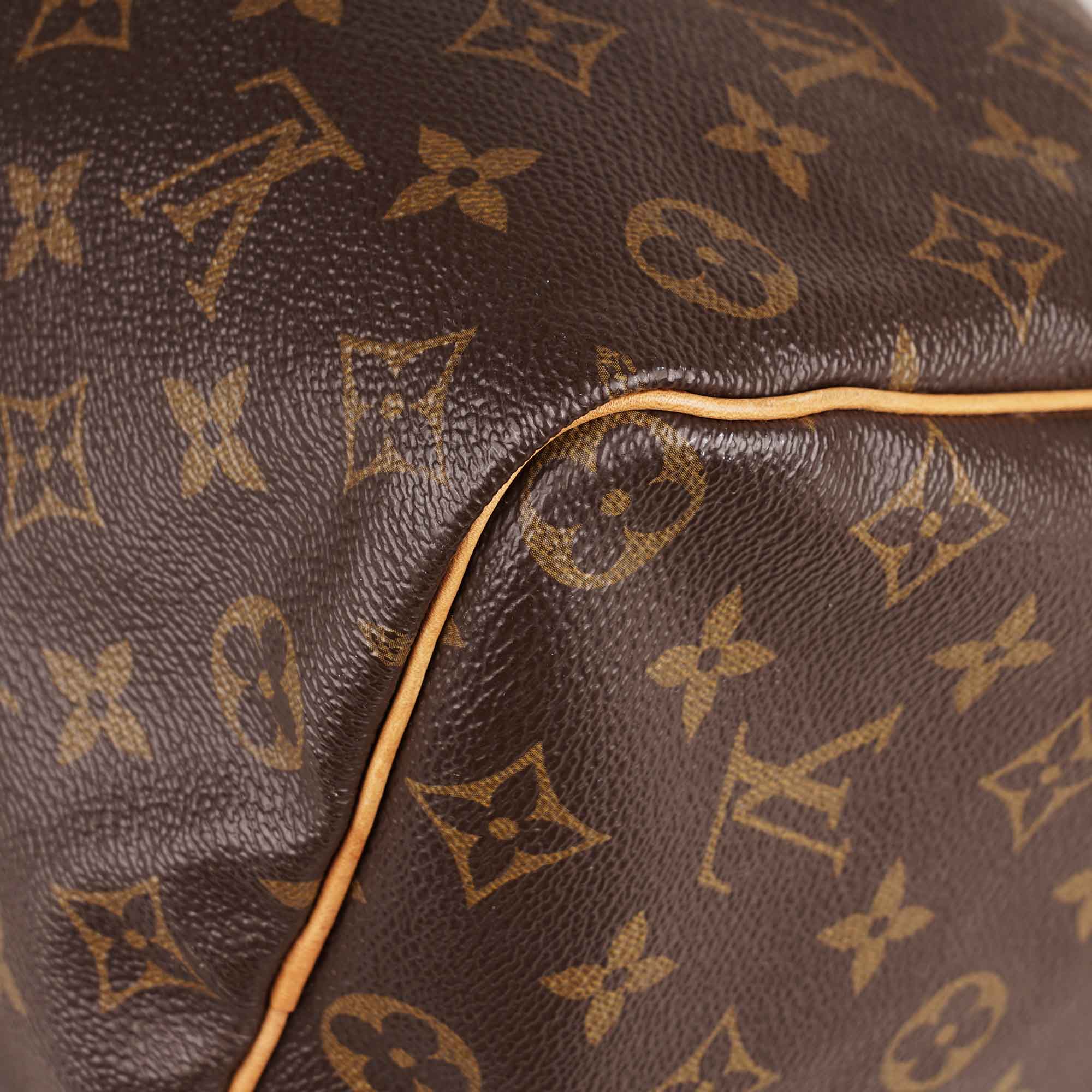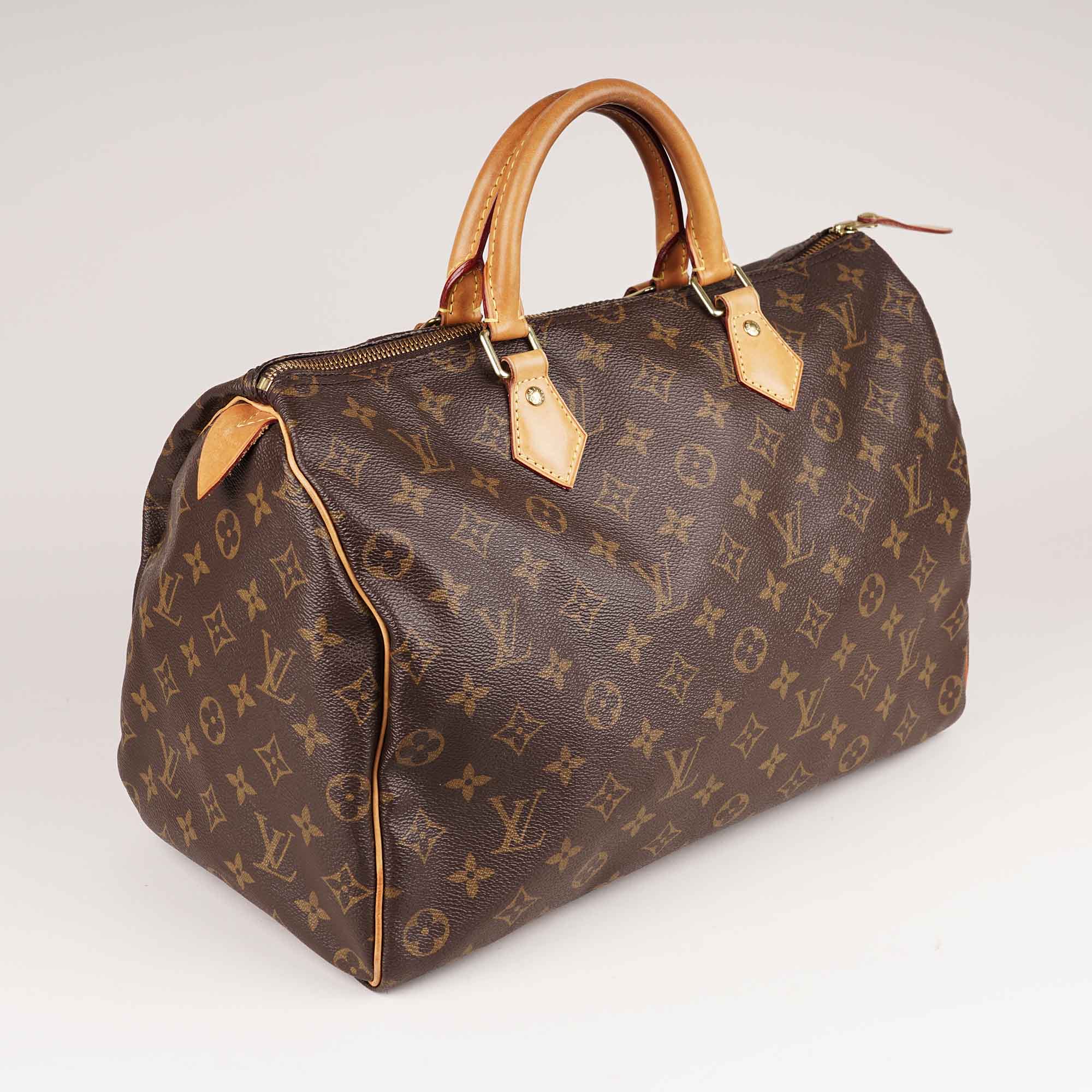 The timeless Louis Vuitton Speedy features Monogram coated canvas, dual vachetta leather top handles, a top zipper that opens up to a brown fabric interior with one flat pocket and gold colored hardware. The versatile Speedy bag is lightweight and elegant which makes it the perfect day to night bag. Don't miss out!