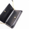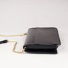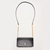 The Saint Laurent Cassandre Phone Holder is crafted from black smooth calfskin with gold-tone hardware. The bag features a front flap adorned with the YSL logo and a fabric interior, perfect for holding your phone and credit cards. The chain strap allows for shoulder and crossbody wear, making this a perfect small everyday bag. Don’t miss out!