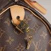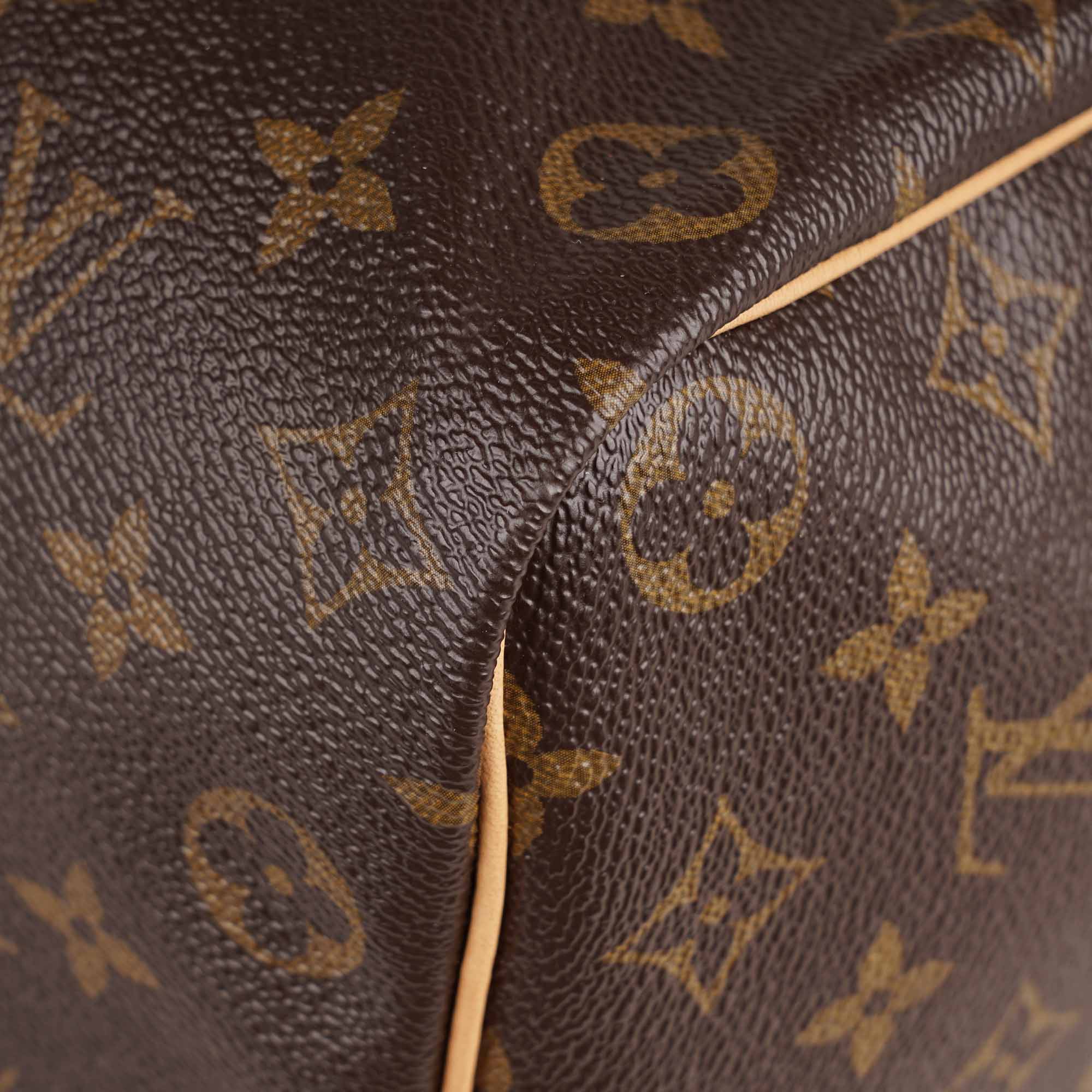 The timeless Louis Vuitton Speedy features Monogram coated canvas, dual vachetta leather top handles, a top zipper that opens up to a brown fabric interior with one flat pocket and gold colored hardware. The versatile Speedy bag is lightweight and elegant which makes it the perfect day to night bag. Don't miss out!