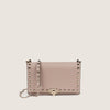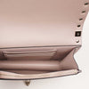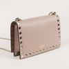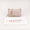 This stunning shoulder bag from Valentino is crafted from beautiful Poudre-colored calf leather, and features Valentinos signature pale gold-tone pyramid studs along the edges and on the partially chain-detailed shoulder strap. The front flap secures with a chic switch-lock closure. The bright interior includes a large compartment and a convenient zip pocket. Carry it on your shoulder or crossbody. Don't miss out!