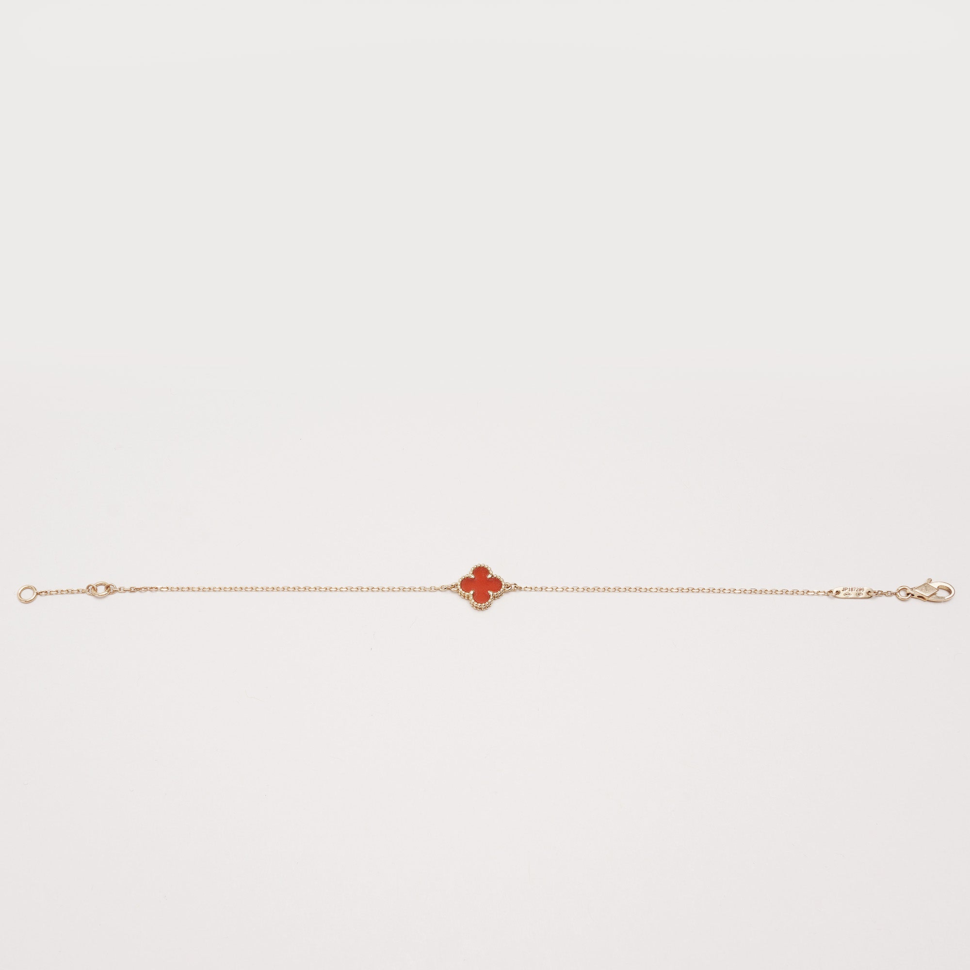 Step into the world of high fashion and luxury with this stunning Sweet Alhambra Bracelet 1 Motif in 18k rose gold and carnelian red. The Van Cleef & Arpels Alhambra bracelet is a symbol of elegance and sophistication. Whether you're dressing up for a special occasion or adding a touch of style to an everyday look, this bracelet is sure to make a statement. With its vibrant red color and intricate design, it's a bold and eye-catching accessory that will elevate any outfit. Complete your look with this exquisite piece and stand out from the crowd with its timeless appeal. Don't miss out!