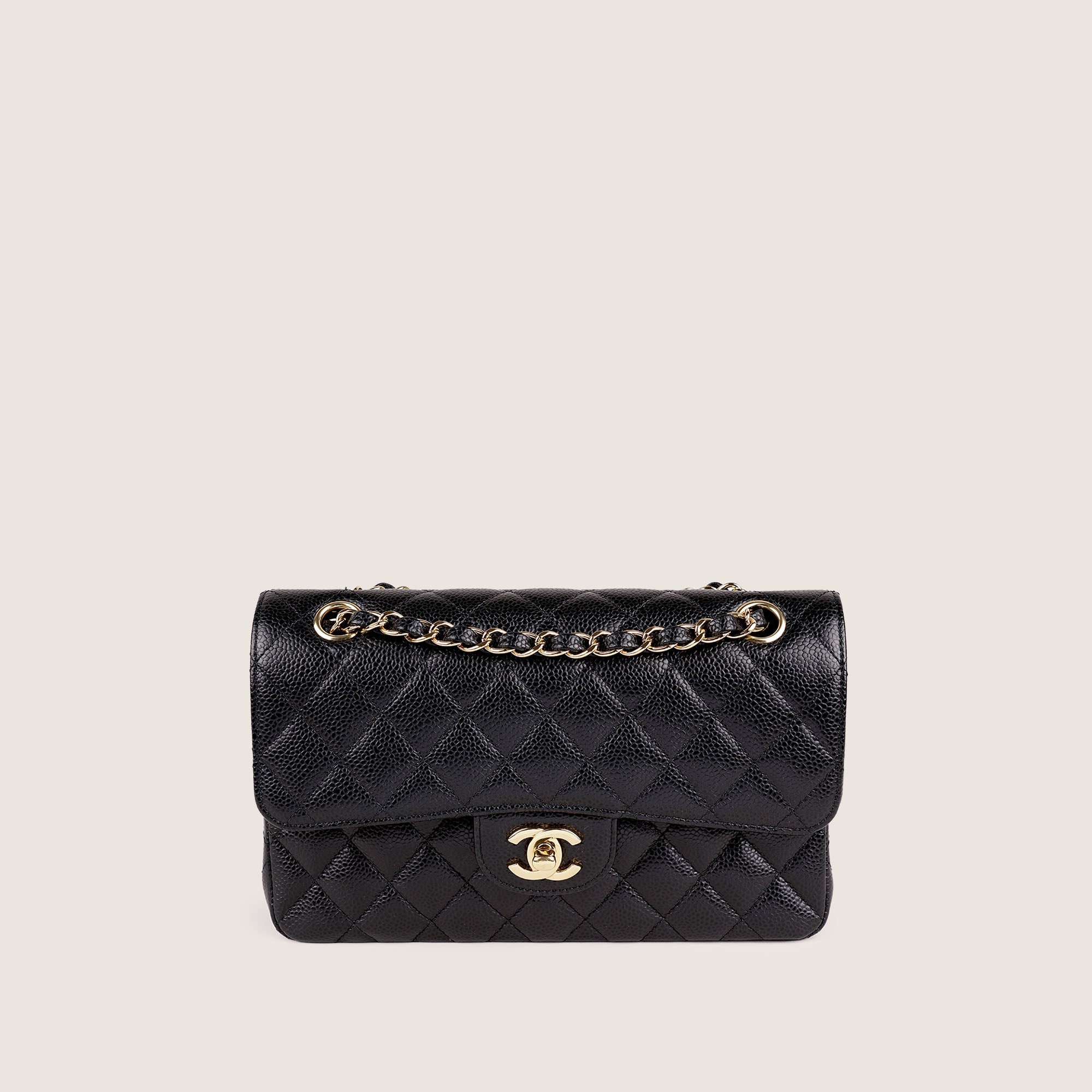Detta är en äkta Chanel Classic Small Double Flap Bag i Black Diamond Quilted Caviar Leather & Gold-colored Hardware.