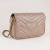 Gucci GG Marmont Super Mini Bag är en charmig och mångsidig väska som förkroppsligar Guccis elegans i ett kompakt format. Tillverkad i den mjuka, feminina nyansen Porcelain Rose och dekorerad med antikguldfärgad hårdvara, balanserar den kvinnlighet och modern sofistikation på ett perfekt sätt.