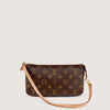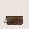Pochette NM ("new model") har en förfinad design med en längre och bredare avtagbar läderrem, vilket gör den mångsidig och enkel att styla. Tillverkad i klassisk Monogram-canvas med guldfärgad metallhårdvara, kan denna pochette bäras som axelväska eller clutch. Det bruna textilfodrade huvudfacket rymmer dina dagliga nödvändigheter såsom telefon, korthållare, nycklar och småsaker, vilket gör den perfekt för vardagsbruk, resor och kvällar ute.