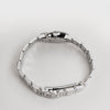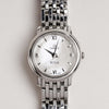 Omega De Ville Prestige har en elegant vit pärlemor med romerska siffror. Tim- och minutvisarna är polerade och rhodiumpläterade, och urtavlan skyddas av reptåligt safirglas med antireflex. Boetten är i rostfritt stål och matchas med ett polerat rostfritt stålarmband. En tidlös och stilren klocka som passar både till vardags och fest. Missa inte denna!