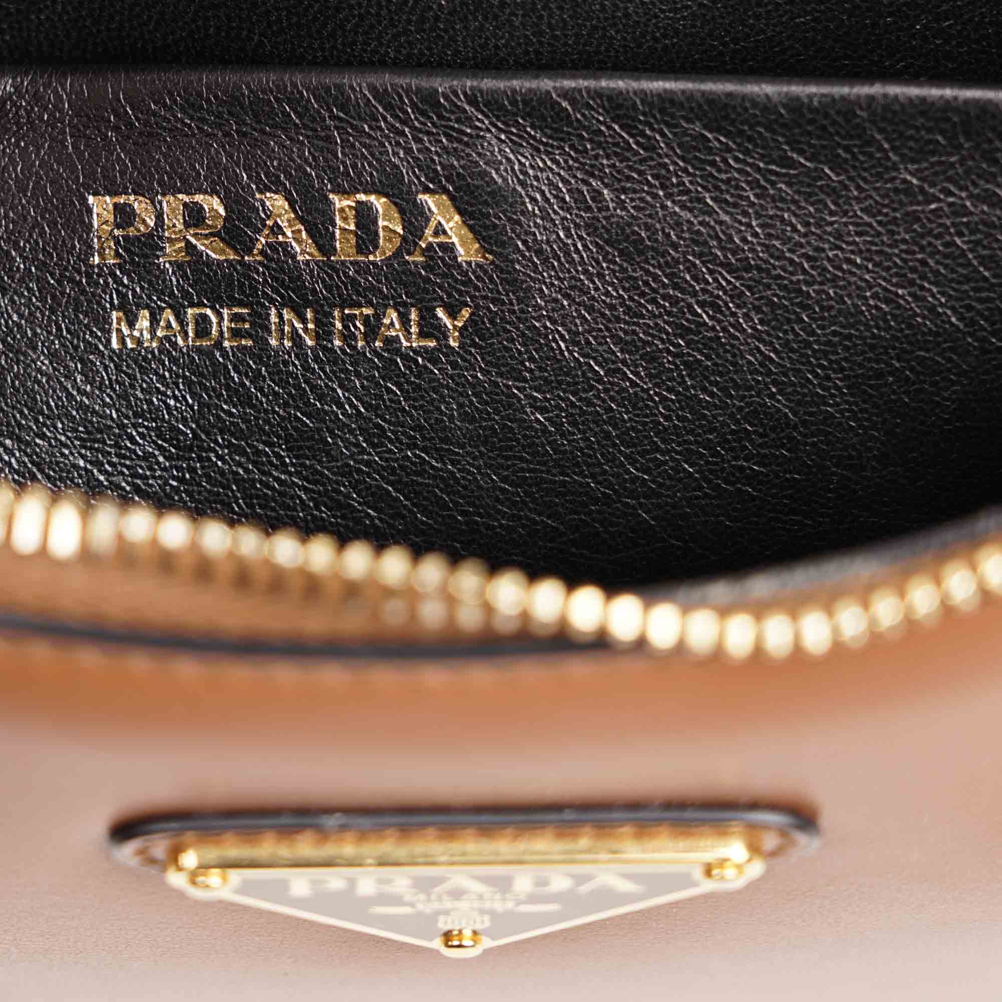 Omfamna tidlös elegans med denna fantastiska väska från Prada! Den graciöst böjda silhuetten drar uppmärksamheten till sig, medan den justerbara, avtagbara axelremmen erbjuder oöverträffad mångsidighet – bär den över axeln eller crossbody för att matcha din livsstil. Tillverkad av vackert konjaksfärgat kalvskinn med svart foder i nappa-läder. Väskan har raffinerade guldmetalldetaljer, Pradas karakteristiska emaljerade triangellogotyp och en dragkedja för trygghet. Den rymliga insidan håller dina viktigaste saker inom räckhåll. Missa inte detta!