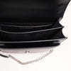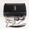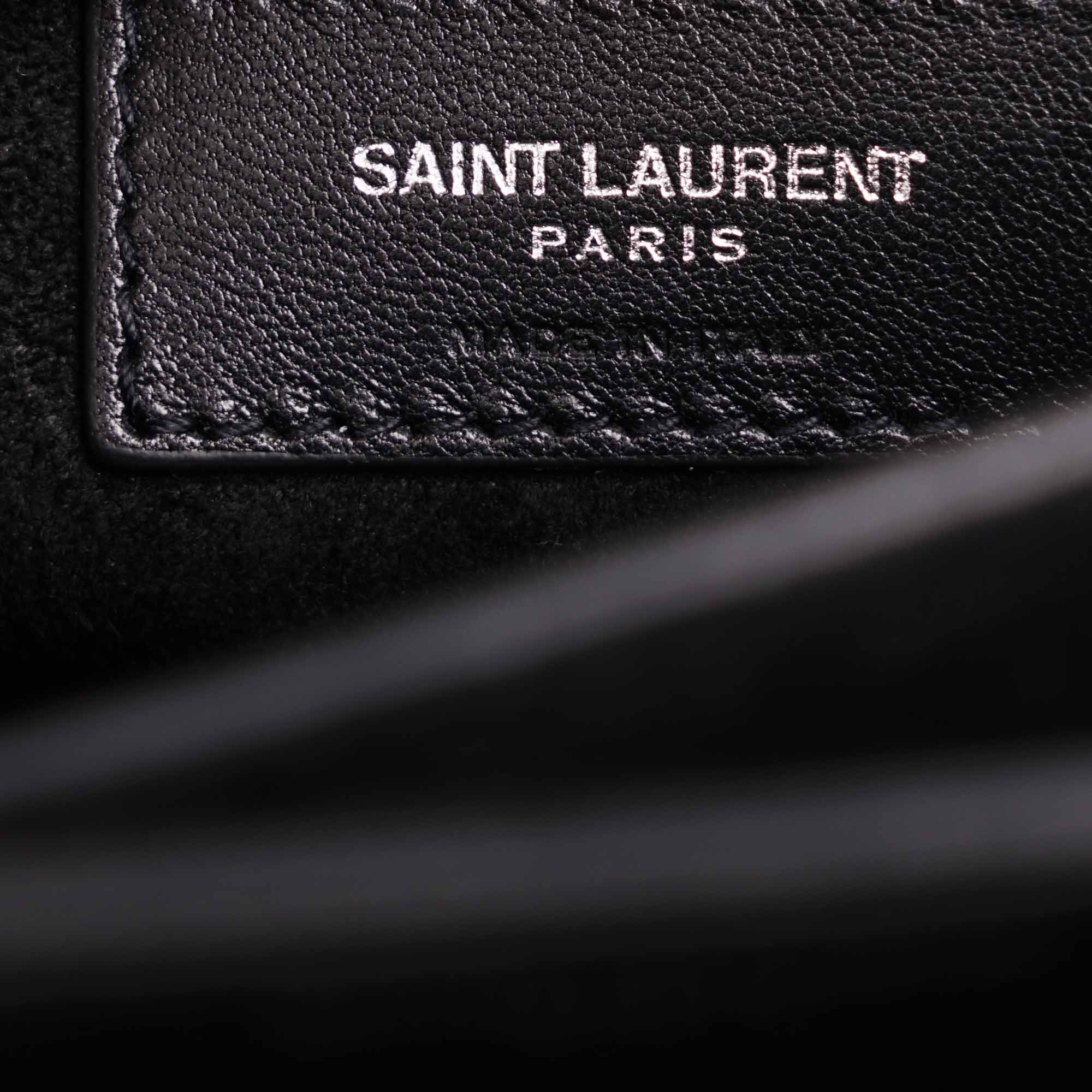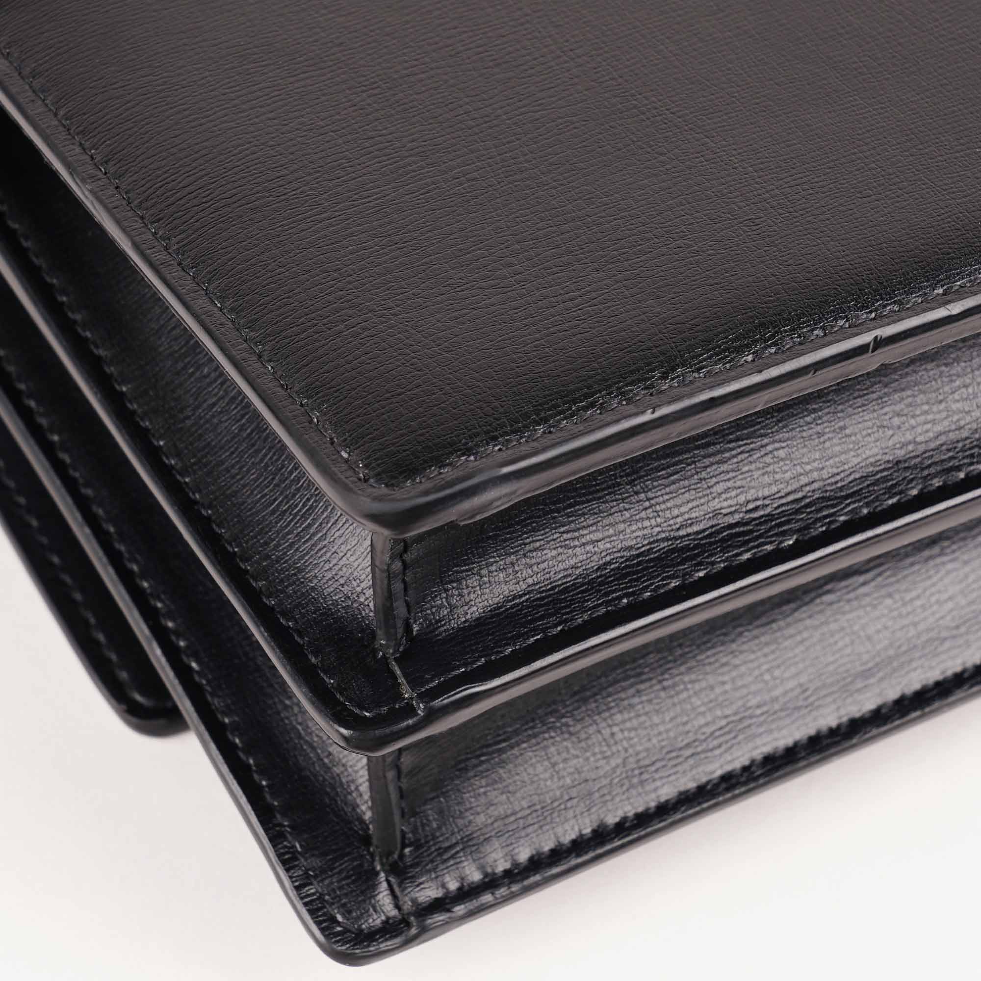 Den här eleganta Saint Laurent Sunset väskan är ett absolut måste! Tillverkad av svart kalvläder, silverfärgad metallhårdvara samt ett invändigt läderfoder. Det magnetiska låset öppnar upp till en interiör med två större centrala fack och en främre ficka. Sidorna har dekorerats som ett "dragspel" och bildar tillsammans med Cassandre-loggan pricken över i:et. Bär väskan över axeln eller som crossbody i den glidande kedjeaxelremmen. Missa inte detta!