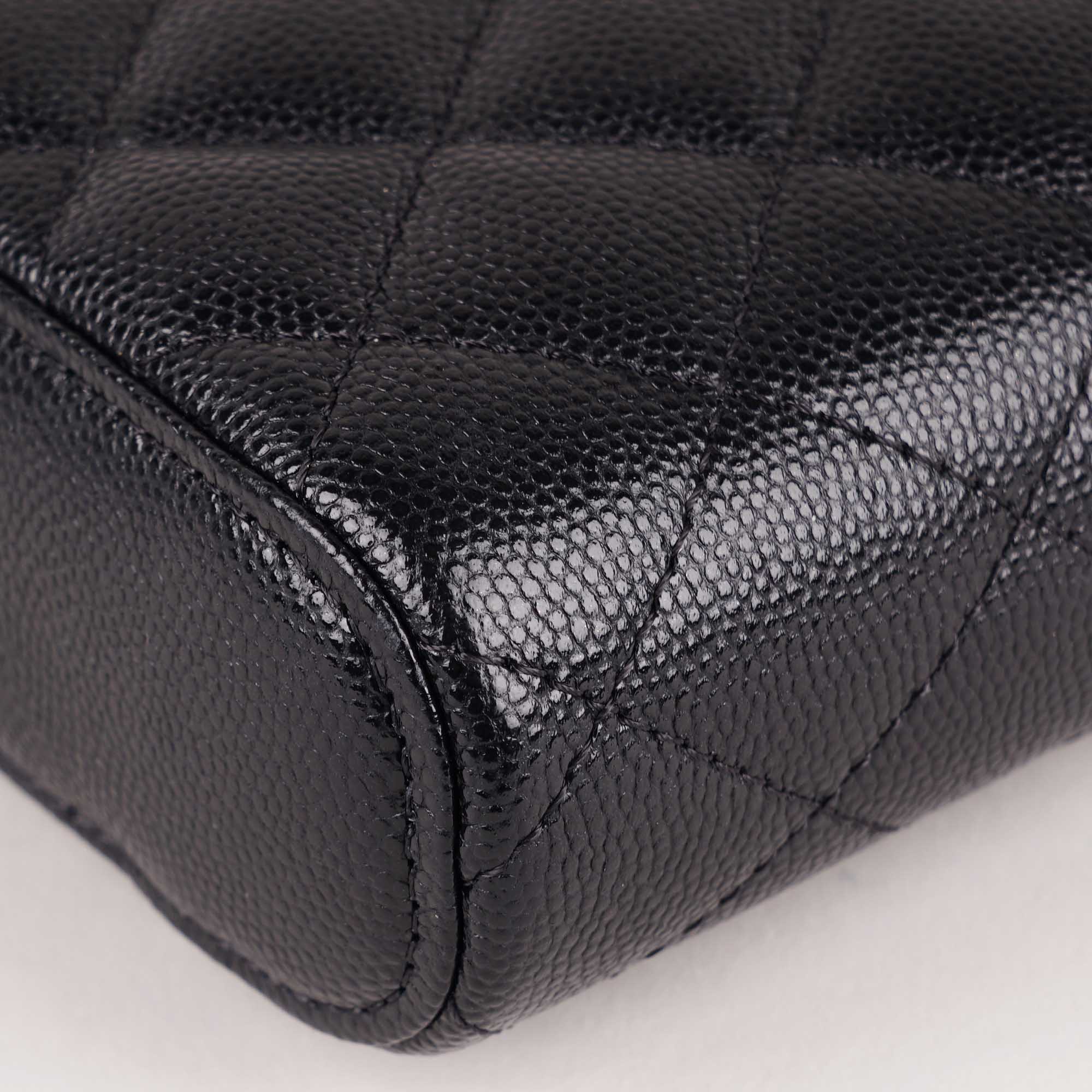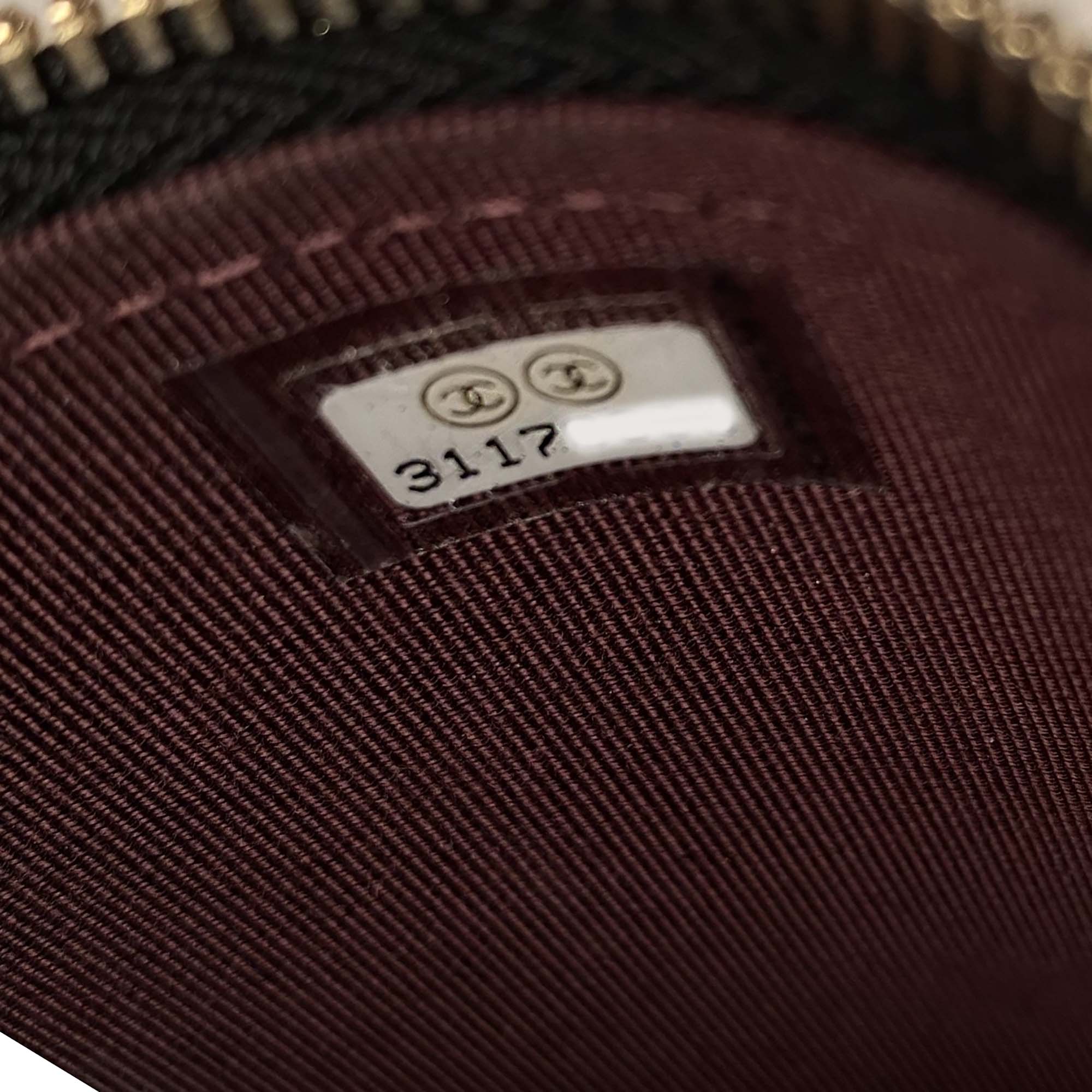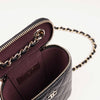 This Chanel Vanity bag is made from durable black diamond quilted caviar leather with gold-colored hardware. It features a leather threaded gold chain-link shoulder strap and a small CC-logo at front. The 3/4 wrap-around zipper opens to a burgundy fabric interior, making it a versatile and stylish shoulder bag for any occasion. Don’t miss out!